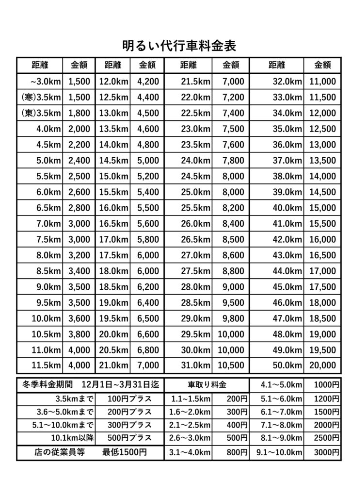 私ども明るい代行車は、西村山から北村山まで山形県内を中心とし、お店からご自宅までの安心をご提供すると共に飲酒運転を無くすため運転代行業務を行っております。